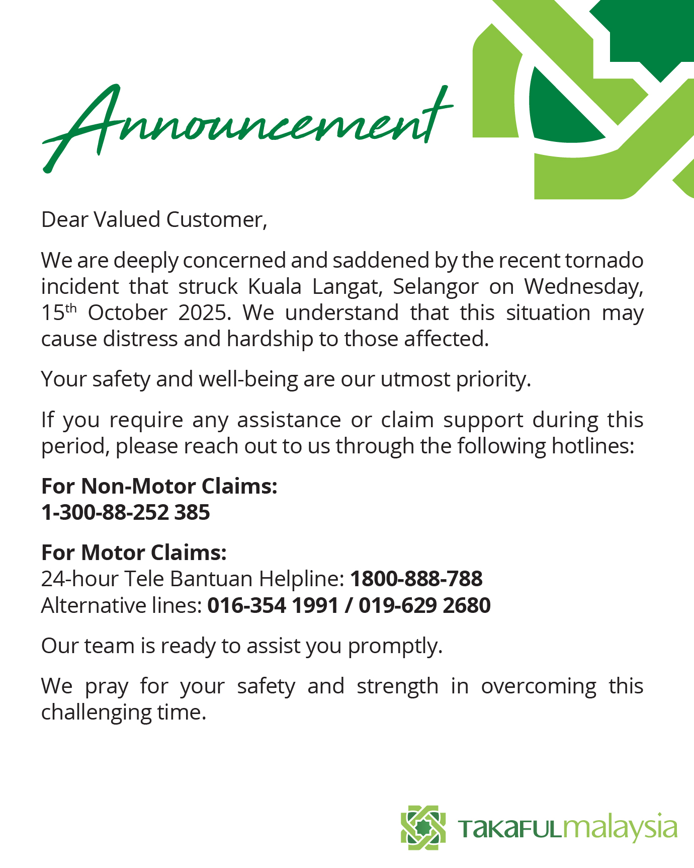 We are deeply concerned and saddened by the recent tornado incident that struck Kuala Langat, Selangor on Wednesday, 15th October 2025. If you require any assistance or claim support during this period, please reach out to us through the following hotlines.