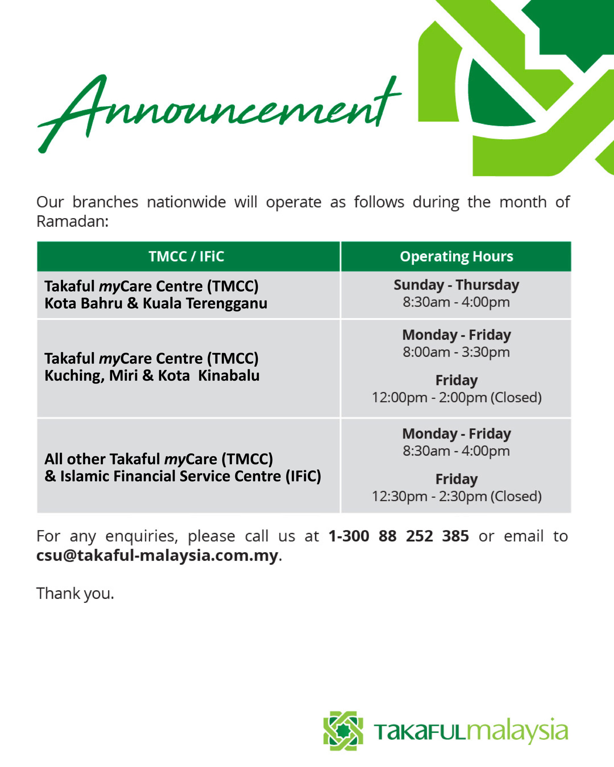 Notice of Operation Hour of TMCC / IFiC During the Month of Ramadan