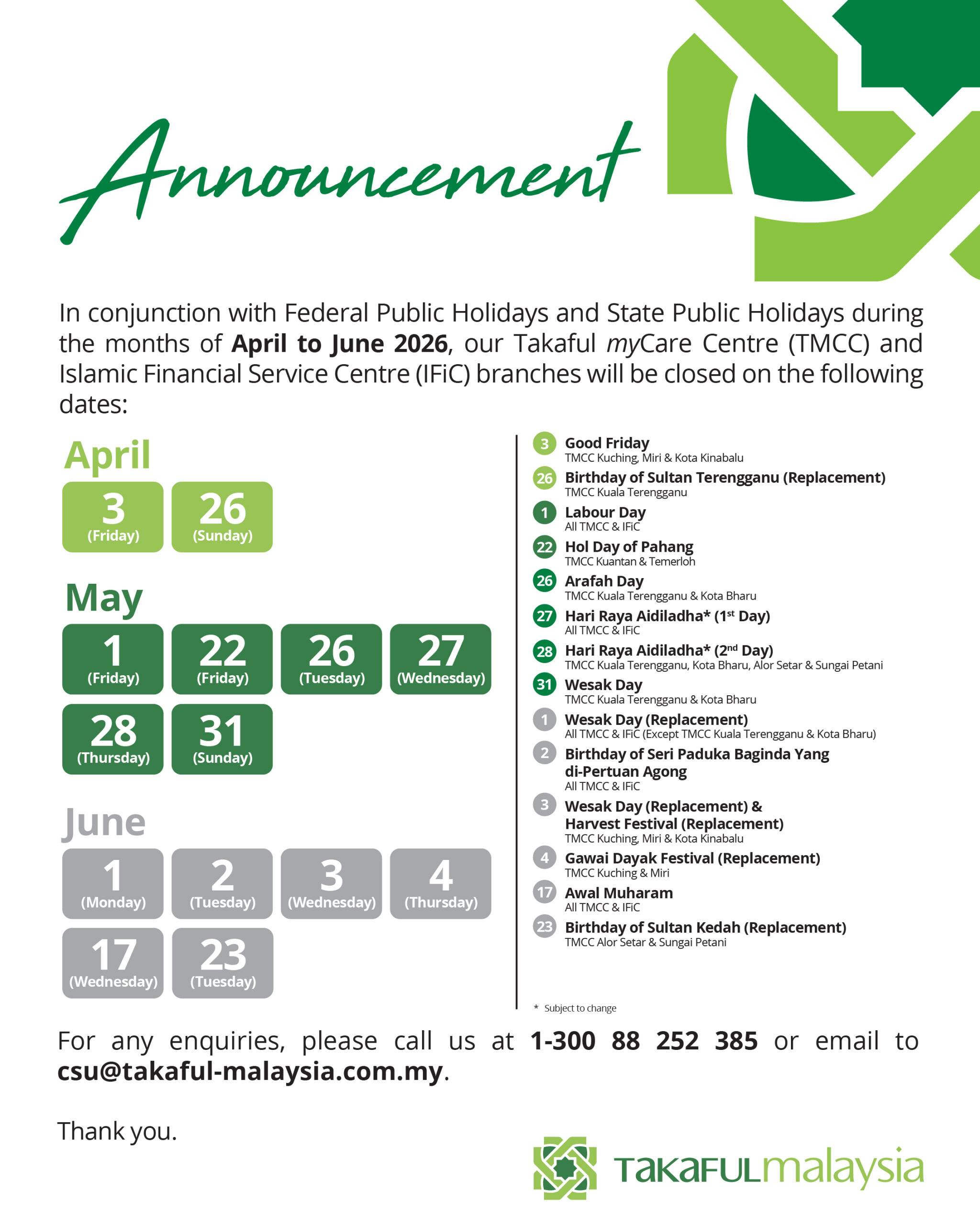 In conjunction with Public Holidays and State Public Holidays during the months of April to June 2026, our Takaful myCare Centre (TMCC) and Islamic Financial Service Centre (IFiC) branches will be closed on the following dates: