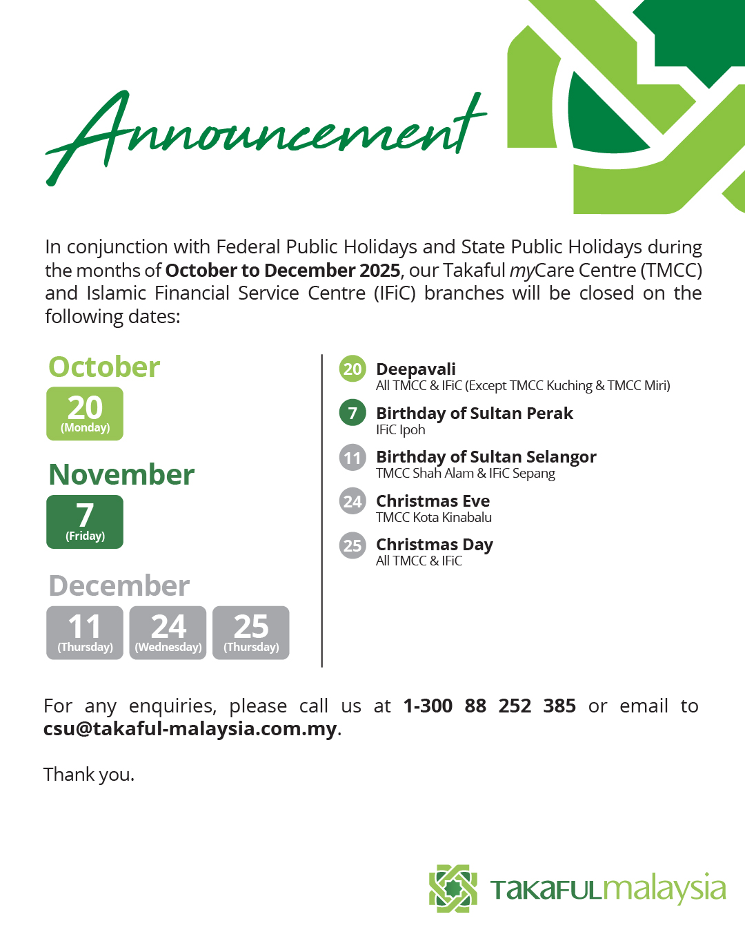 In conjunction with Public Holidays and State Public Holidays during the months of October to December 2025, our Takaful myCare Centre (TMCC) and Islamic Financial Service Centre (IFiC) branches will be closed on the following dates: