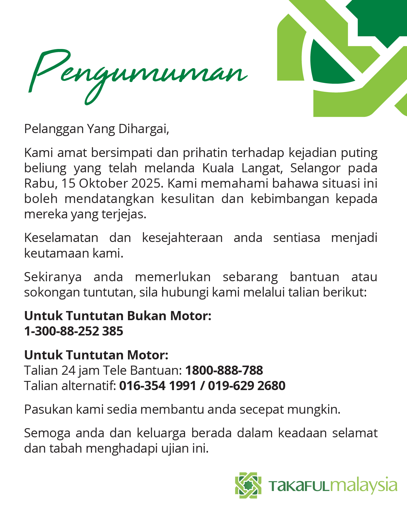 Kami amat bersimpati dan prihatin terhadap kejadian puting beliung yang telah melanda Kuala Langat, Selangor pada Rabu, 15 Oktober 2025. Keselamatan dan kesejahteraan anda sentiasa menjadi keutamaan kami. Sekiranya anda memerlukan sebarang bantuan atau sokongan tuntutan, sila hubungi kami melalui talian berikut.